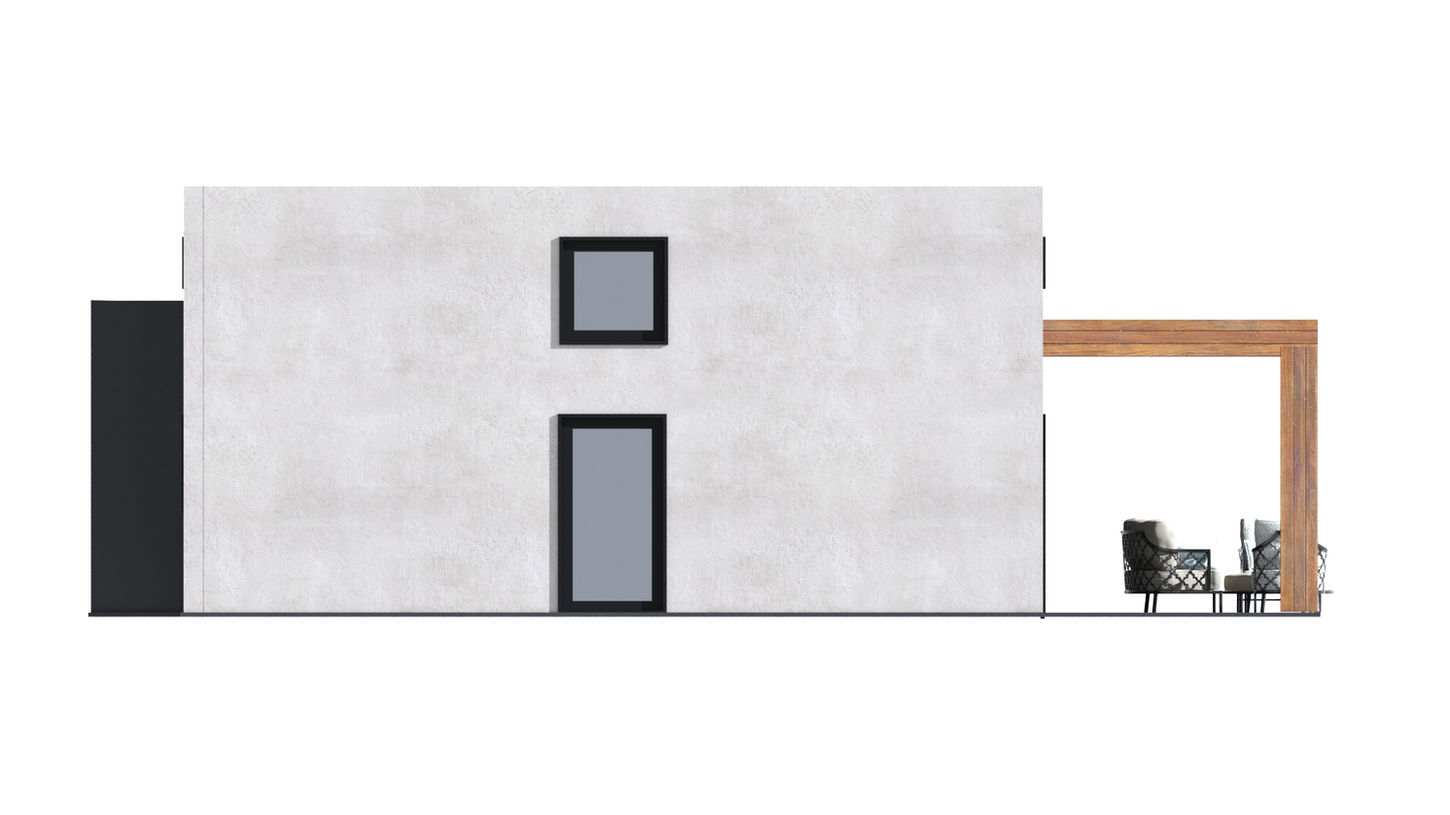 The front combines vertical wooden paneling with dark framing and a light-colored block extension, creating a striking yet warm aesthetic.